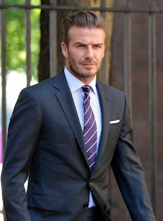 4. David Beckham in a grey suit with purple and silver striped tie.